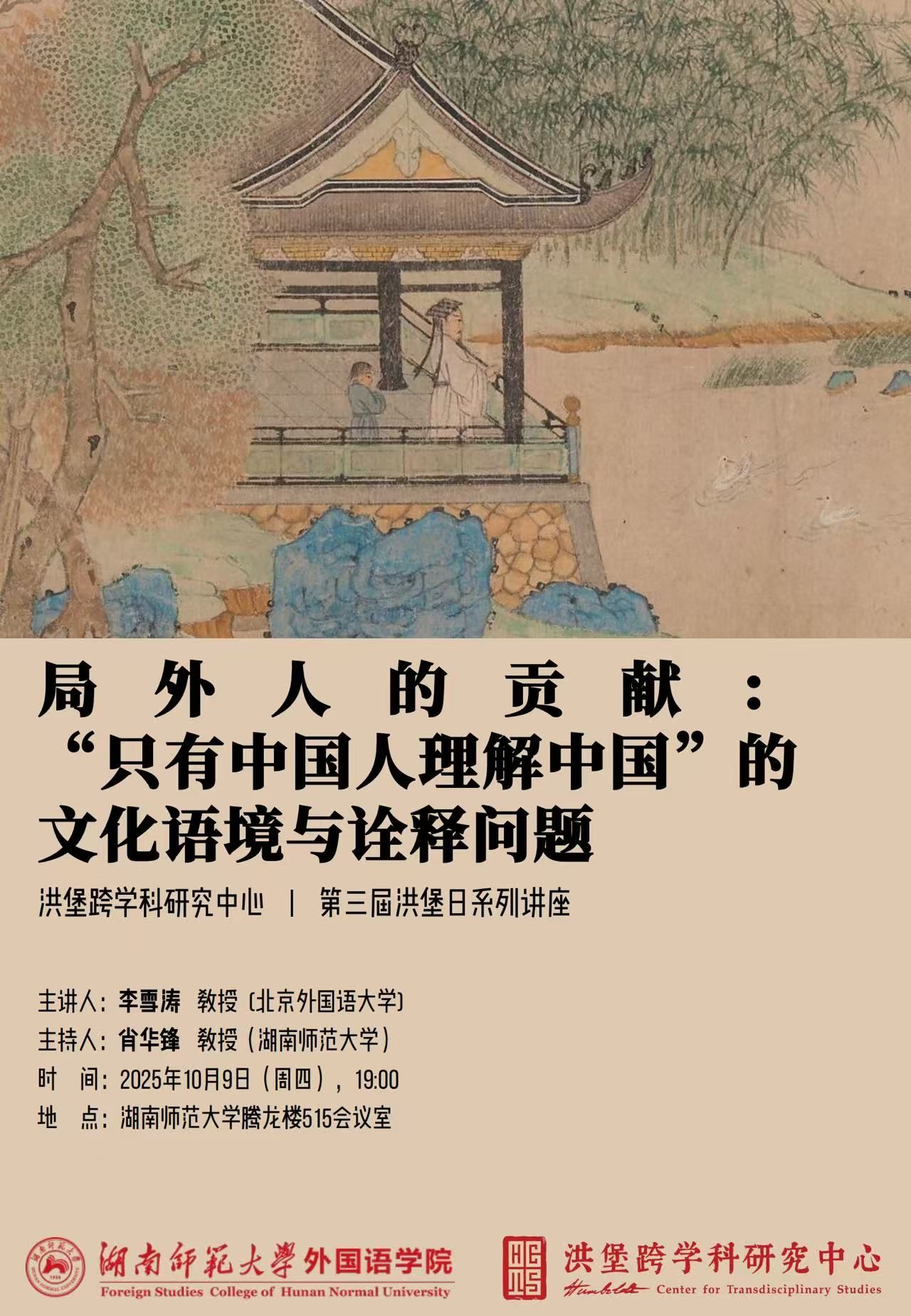2025年10月10日晚,北京外国语大学历史文化学院院长李雪涛教授应邀莅临湖南师范大学,作“局外人的贡献:‘只有中国人理解中国’的文化语境与诠释问题”的专题讲座。讲座系第三届洪堡日国际论坛“洪堡的宇宙:伦理与审美”系列学术活动之一,旨在向我校师生介绍和分享目前洪堡研究的前沿视角与问题意识。讲座在外国语学院腾龙楼515会议室举行,由外国语学院肖华锋教授主持。现场座无虚席,学术氛围浓厚。讲座伊始,李雪涛教授...
